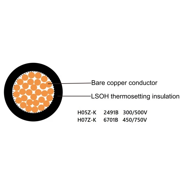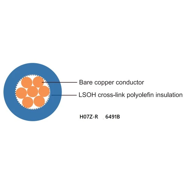 LSZH izolovaný jednožilový kábel, ktorý sa skladá z medeného vodiča T1R a kríženej polyolefínovej izolácie LSOH (tiež nazývanej termosetová LSOH).